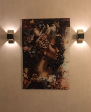 Je ziet hier het glasschilderij Butterfly Hair mooi uitkomen op de groene muur!