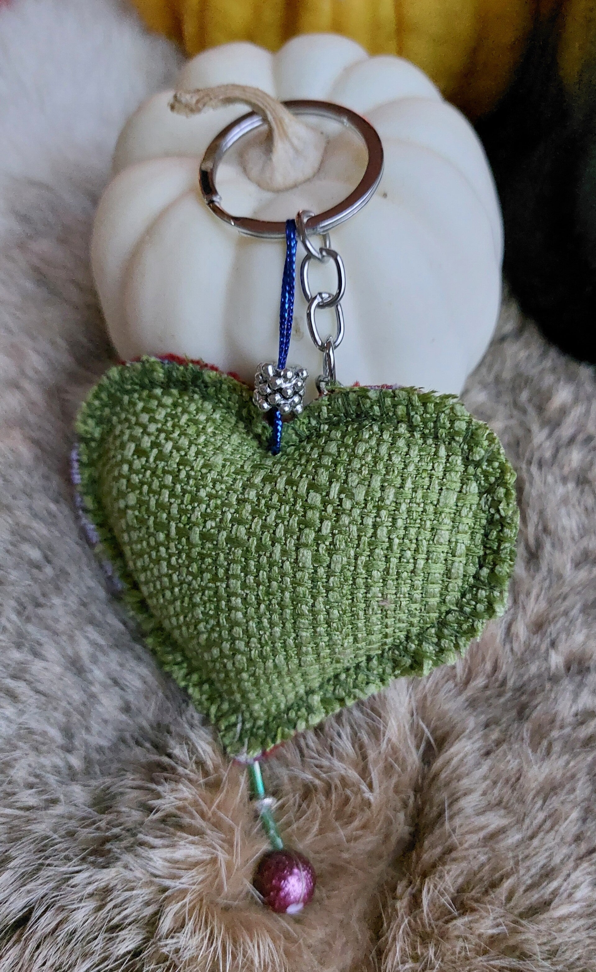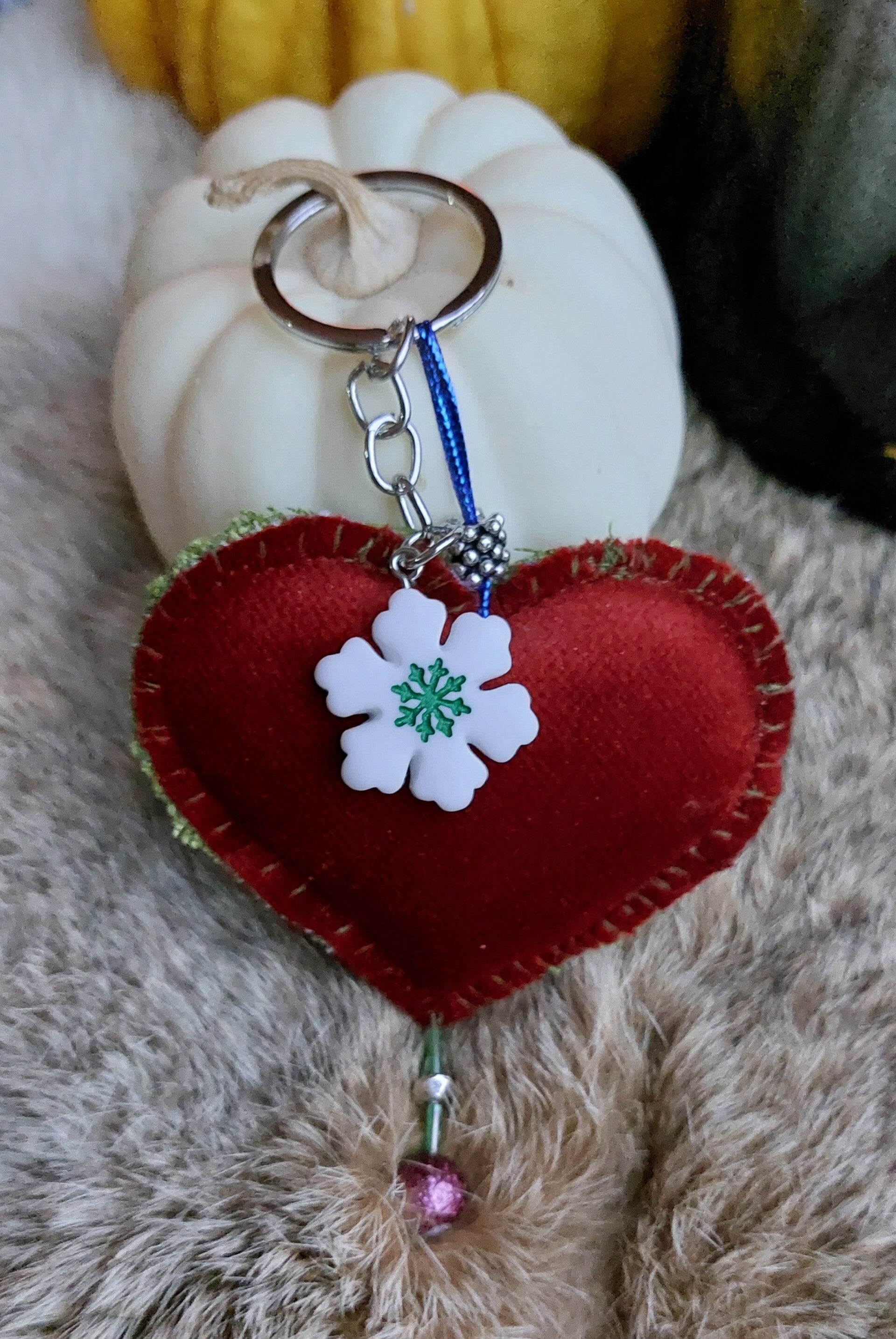 Mooie kersthanger van stof en kralen, te gebruiken als hanger voor in de kerstboom of als sleutelhanger.
