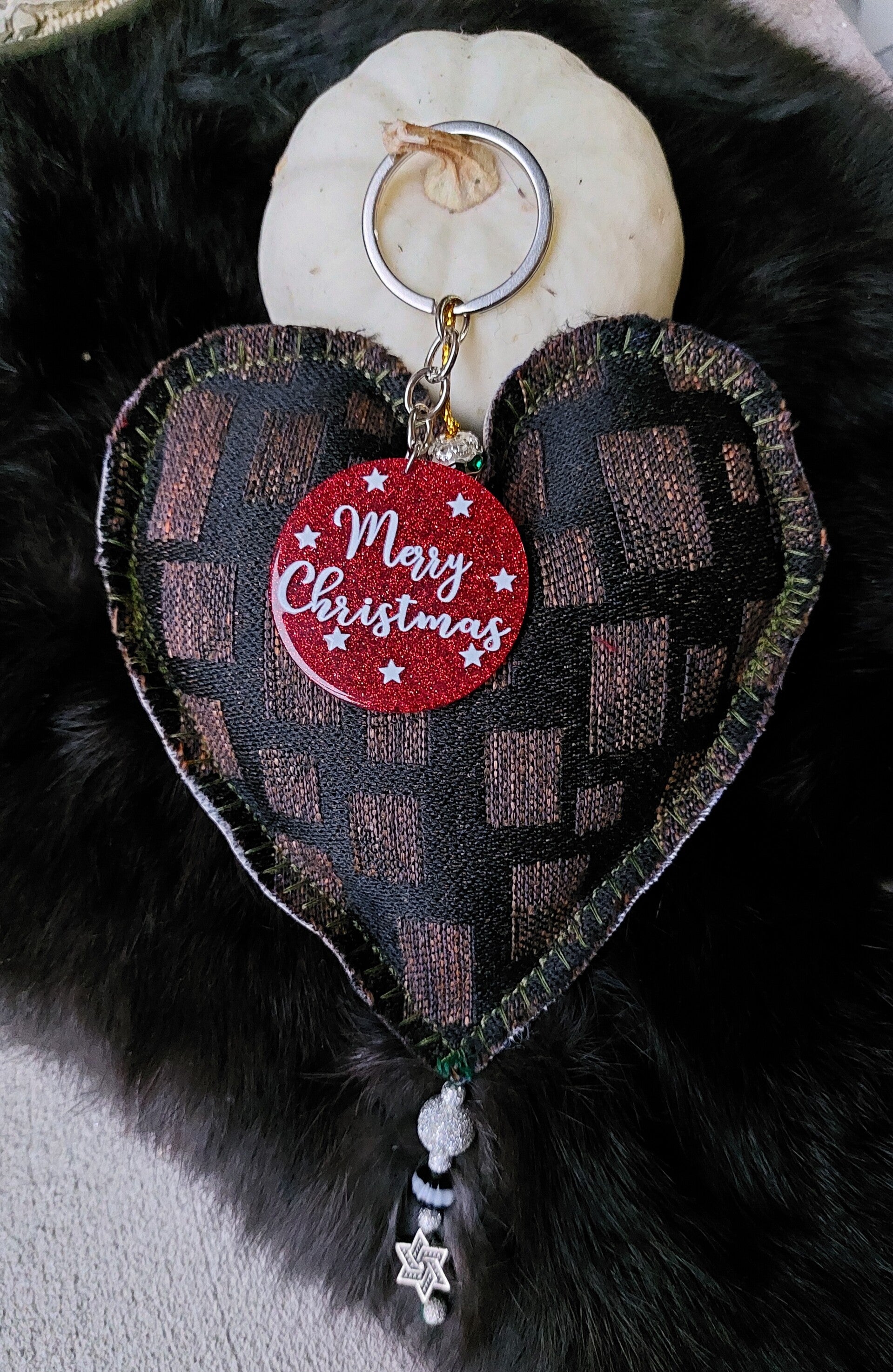 Mooie kersthanger van stof en kralen, te gebruiken als hanger voor in de kerstboom of als sleutelhanger.