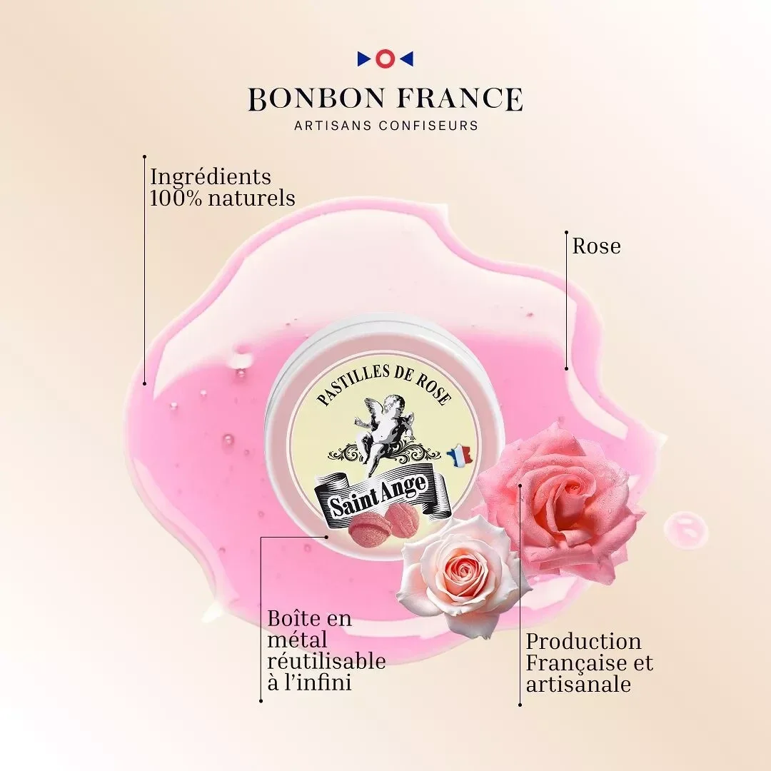 Saint-Ange Pastilles met rozensmaak bieden een elegante en verfijnde smaakervaring, geïnspireerd op de bloemige en romantische wereld van de roos. Ze worden met de hand gemaakt in de Auvergne en langzaam gemaakt in koperen vaten, volgens de bewaarde traditionele knowhow.