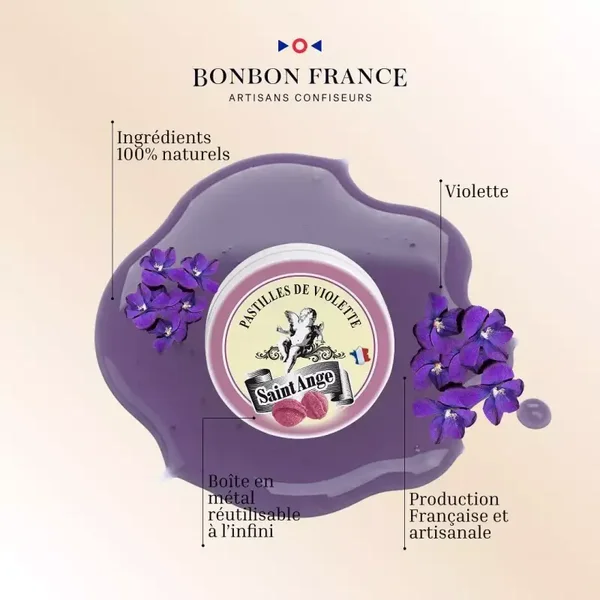 De Saint-Ange pastilles met viooltjessmaak nodigen u uit voor een delicate zintuiglijke reis, tussen bloemige geuren en jeugdherinneringen.