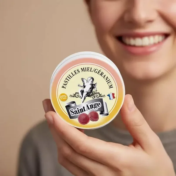 Saint-Ange Pastilles met honinggeraniumsmaak onthullen een origineel en verfijnd recept, waarbij de zoetheid van honing samengaat met de bloemige subtiliteit van geranium.